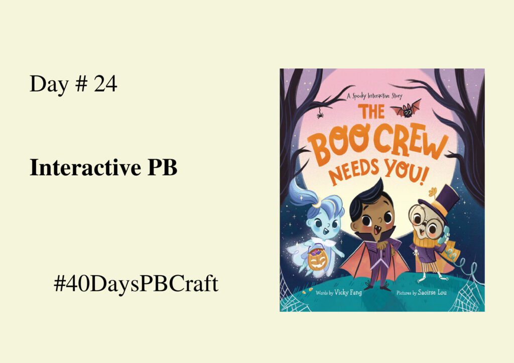 The story of Boo Crew Needs You! (2023, Vicky Fang, Saoirse Lou) happens on Halloween night. But things go wrong, and even the Boo team—a ghost, a skeleton, a vampire—cannot save Halloween. The team invites the reader to help them in playful tasks like fixing crooked haunted houses, repairing broken pumpkins, and making them an essential part of the story’s adventure.